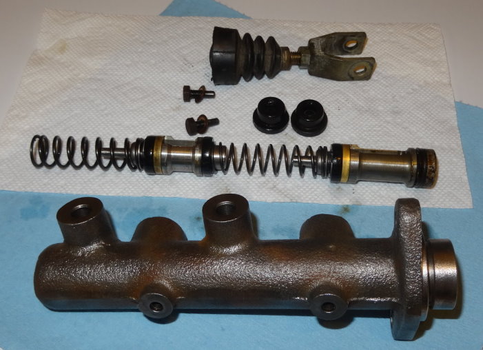 The clutch master is just one piston, compared to the dual-piston, dual-line brake system pictured above. The clutch slave is even simpler with just one rubber seal. All are being replaced, along with the brake balancer and all flexible hoses. That should resolve any brake issues. And I won't have to worry about the clutch system either.