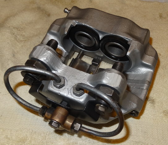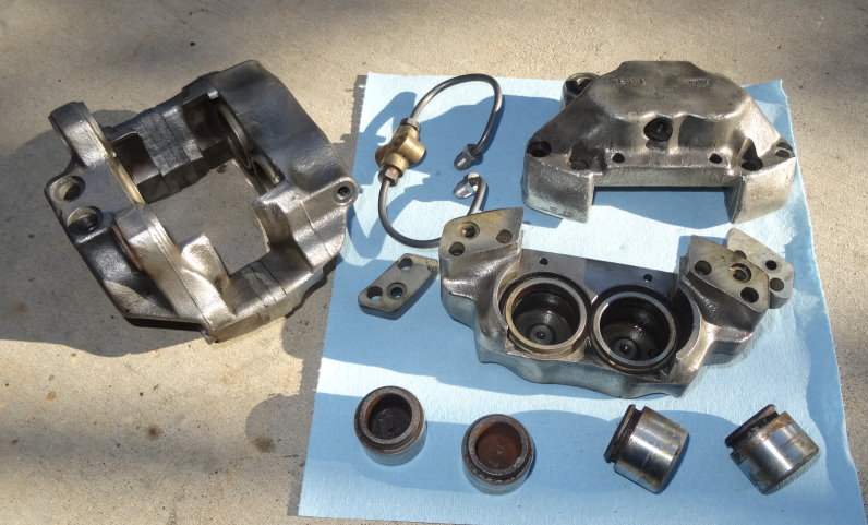 The rear calipers are much like the front, only smaller. While the front has 40mm pistons, the rears are 34mm. Brake calipers get dirty! The one on the left has been cleaned up and wire brushed to remove most of the dirt and grime. The dismantled one has been bead-blasted, after masking off the critical surfaces. After a thorough cleaning, including all passages and grooves for the new seals, it will be painted like the fronts.