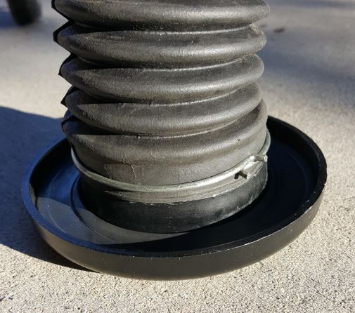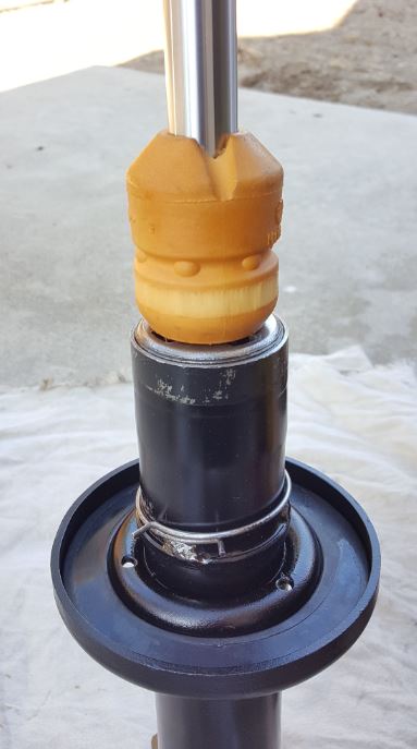 Finding the right boots was difficult. They had to be the correct length and diameter (big enough to cover the strut and small enough to fit inside the springs), and have the right top and bottom opening (different sizes). After ordering a few that didn't work, I finally found ones that did. (If you're really curious, write me.) When assembling, put the boot on the top part first. After it's all together the bottom part can be (painfully) worked over the bottom of the shock.
