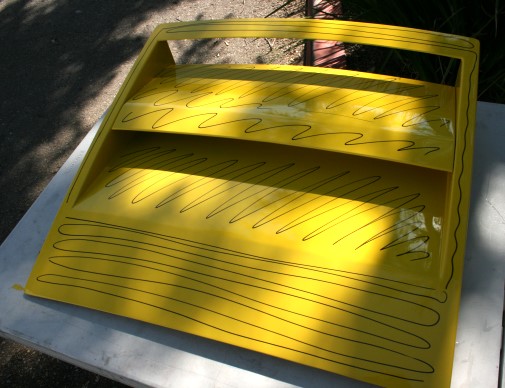 I started with the front bonnet by drawing lines on it with a Sharpie permanent marker. The ink acts like a guide coat and won't get rinsed off by the water from wet sanding.
