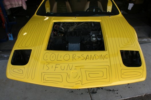 I sanded the headlight buckets, doors, trunk lid, and started on the car.