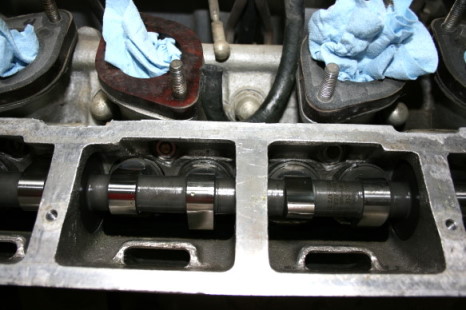 I was excited that Erik reported the engine is in excellent shape! The cams are perfect and a bore scope showed the pistons and cylinders have no signs of rust. He was able to easily turn the engine over by hand. Here is one of the two cams. (Remember, this is SOHC, not DOHC.) The reason the lobes appear to have some texture is because Erik coated them with clear assembly lube. A couple of valve gaps are a bit out, so he's going to change the shims.