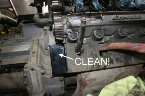 Also, although the engine is pretty dirty from years of sitting and sanding dust, I think it will be easy to clean. When the engine was rebuilt all of the sheet metal had been powder coated semi-gloss black. Here I just wiped off part of the head shield and it looks great.