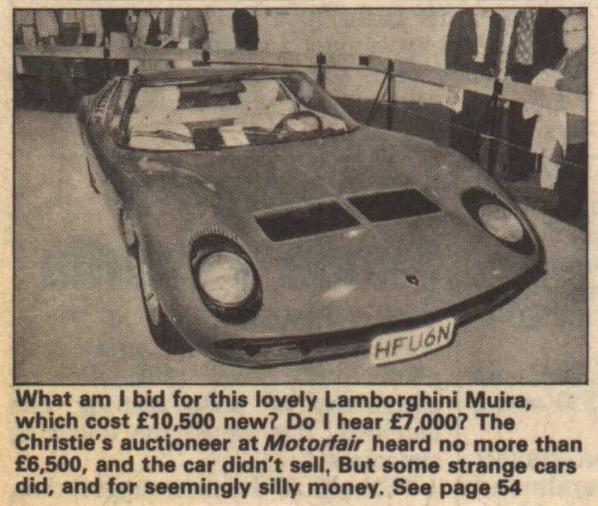 A visitor to this site sent me this photo from Motor magazine, November 12, 1977. I have since acquired a copy of this issue. The article is about Christie's auction at Motorfair. The only reference to the Miura is "But a Lamborghini P400 Miura, body by Bertone, which surely must be in the dream-car class and cost £10,500 new only in 1969 could not raise more than £6,500 and didn't sell." (Click image to enlarge.) |