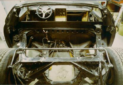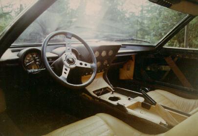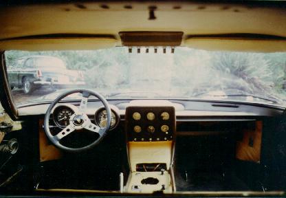 The engine's view of the interior. It would be hard to take this picture if the engine were in the car. Notice the P400 toggle switches in the headliner. These will be replaced with the S rocker switches. That's my 1967 MGB in front. I still have it. It is next in line for restoration after the Urraco is gone and the Miura is finished. |