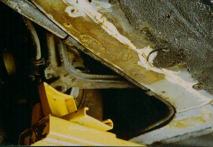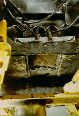 Right front frame rail. Here, showing earlier repair work. This has all been removed and redone. The circular plate allows access to the gas tank drain plug. |