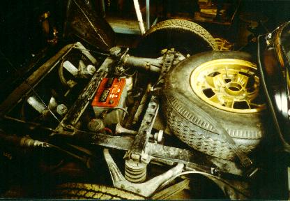 Front compartment. Dirty, but all there. Although the car was in bad condition, all the parts are present, including rare parts like the rubber straps holding the spare tire in. They have been carefully preserved and will be used on the finished restoration. |